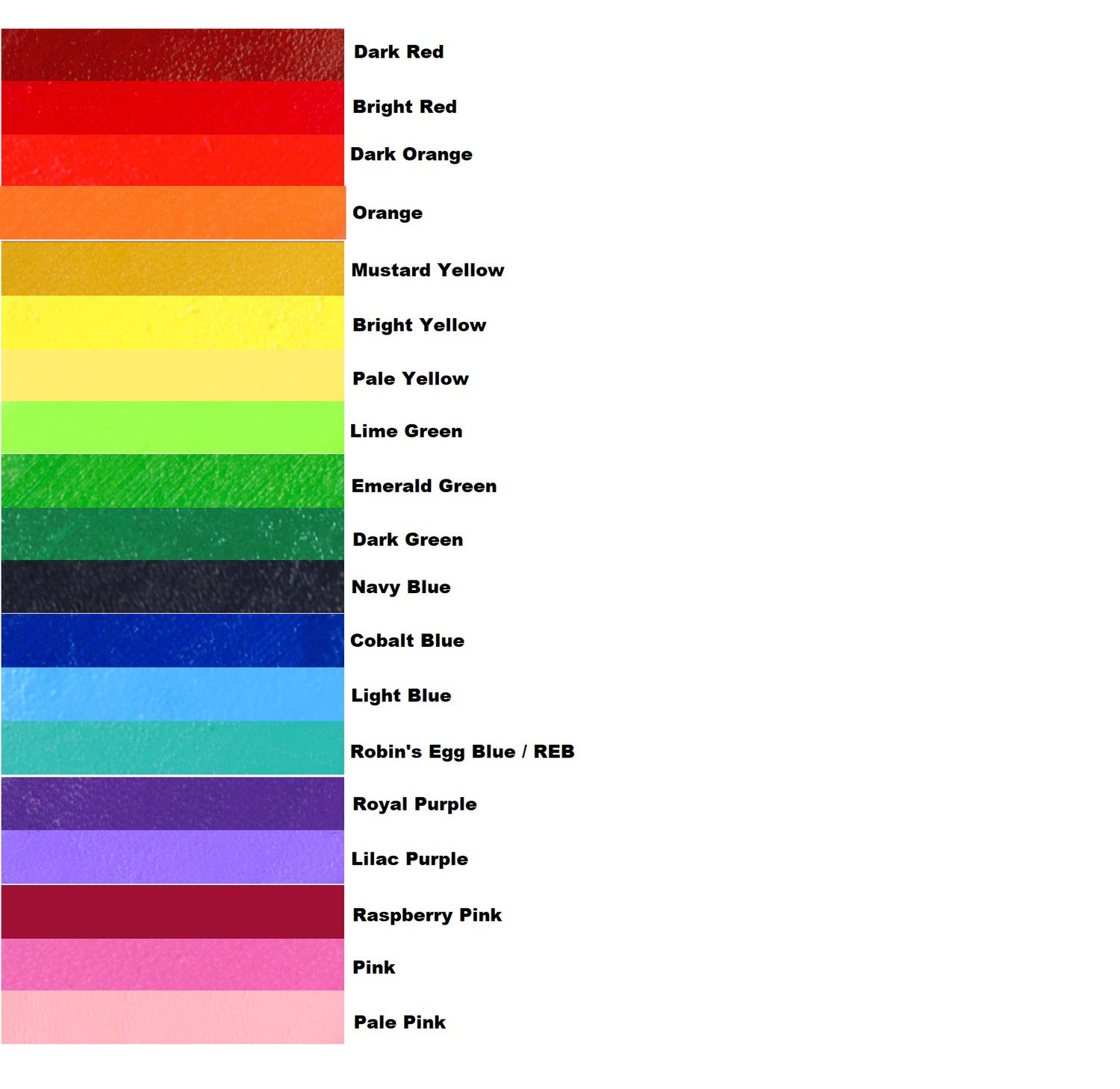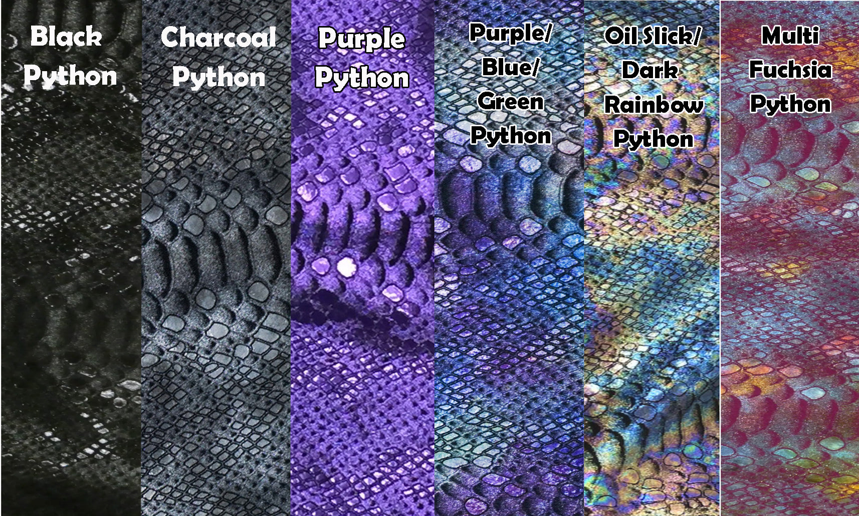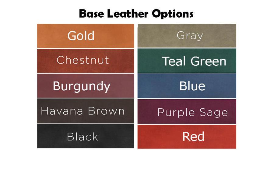 Picture examples of our available leather and crystal color options. Please note that colors may be different in person than they appear on your screen. Every effort has been made to ensure the colors are as accurate as possible.