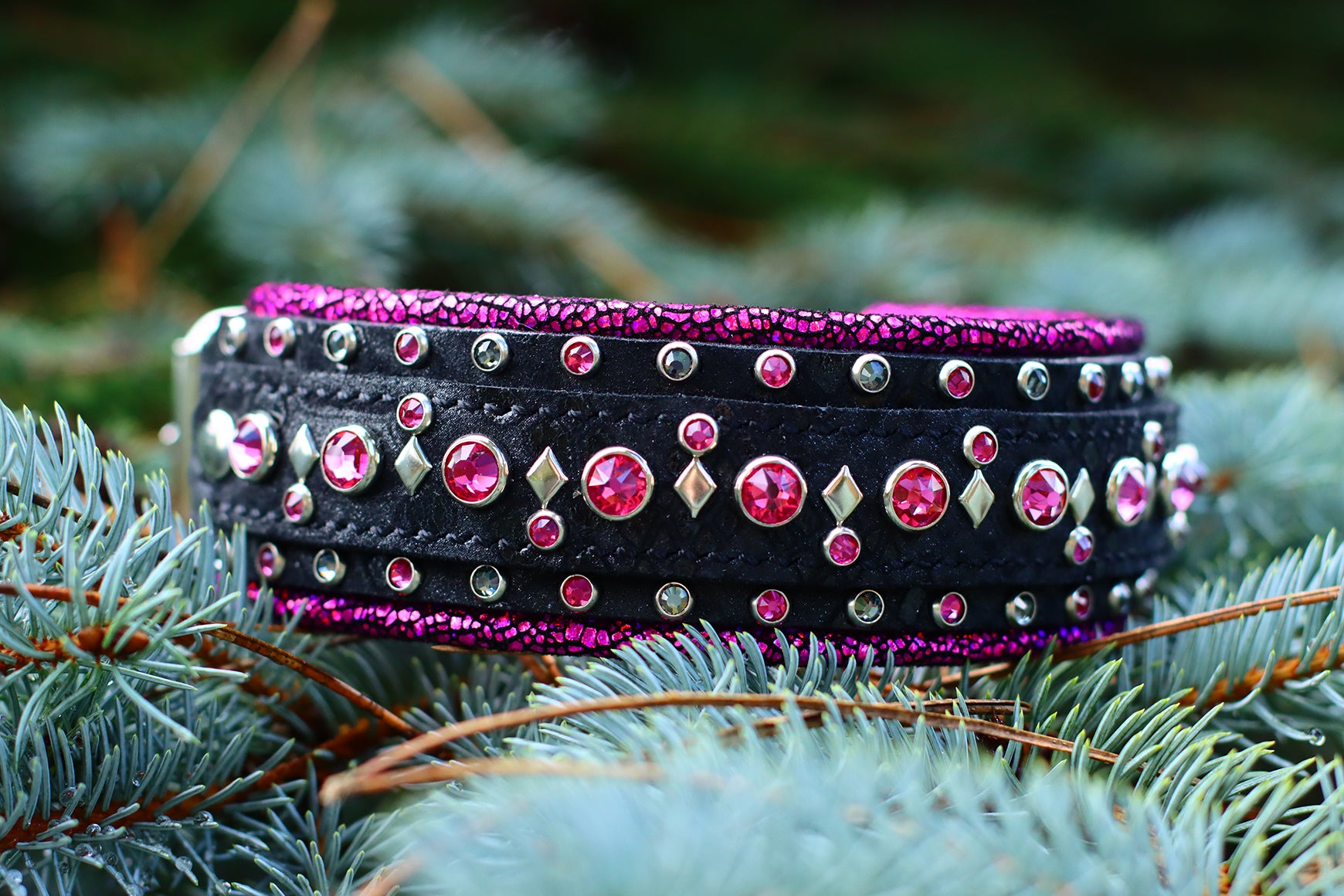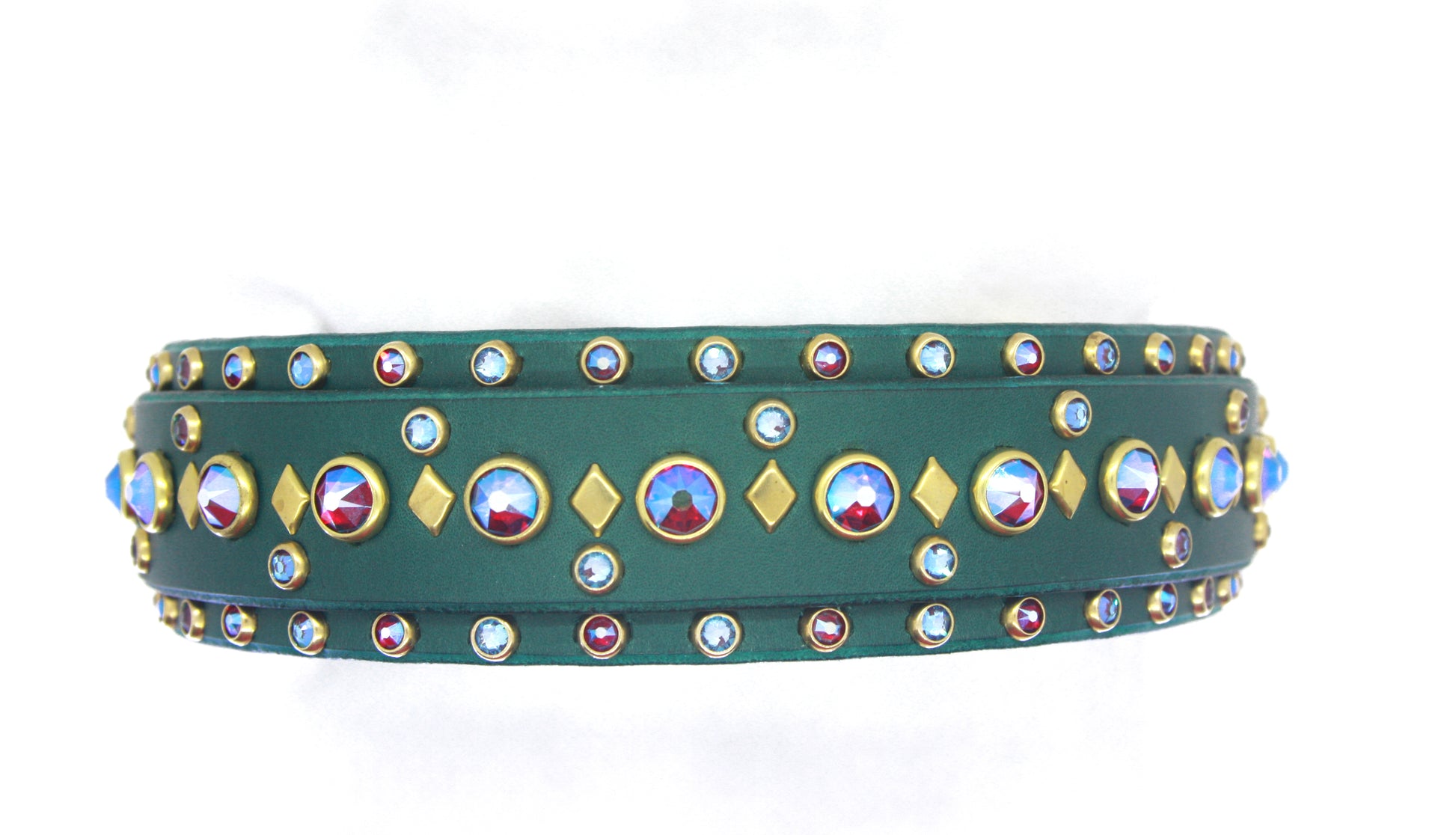 The 1.5" Jester is a double layer design with a 1.5" base panel and a 1" top panel. The base has an all crystal border, the top panel has a single centered row of 40ss crystals and small flat diamond spots and alternating 20ss crystals.