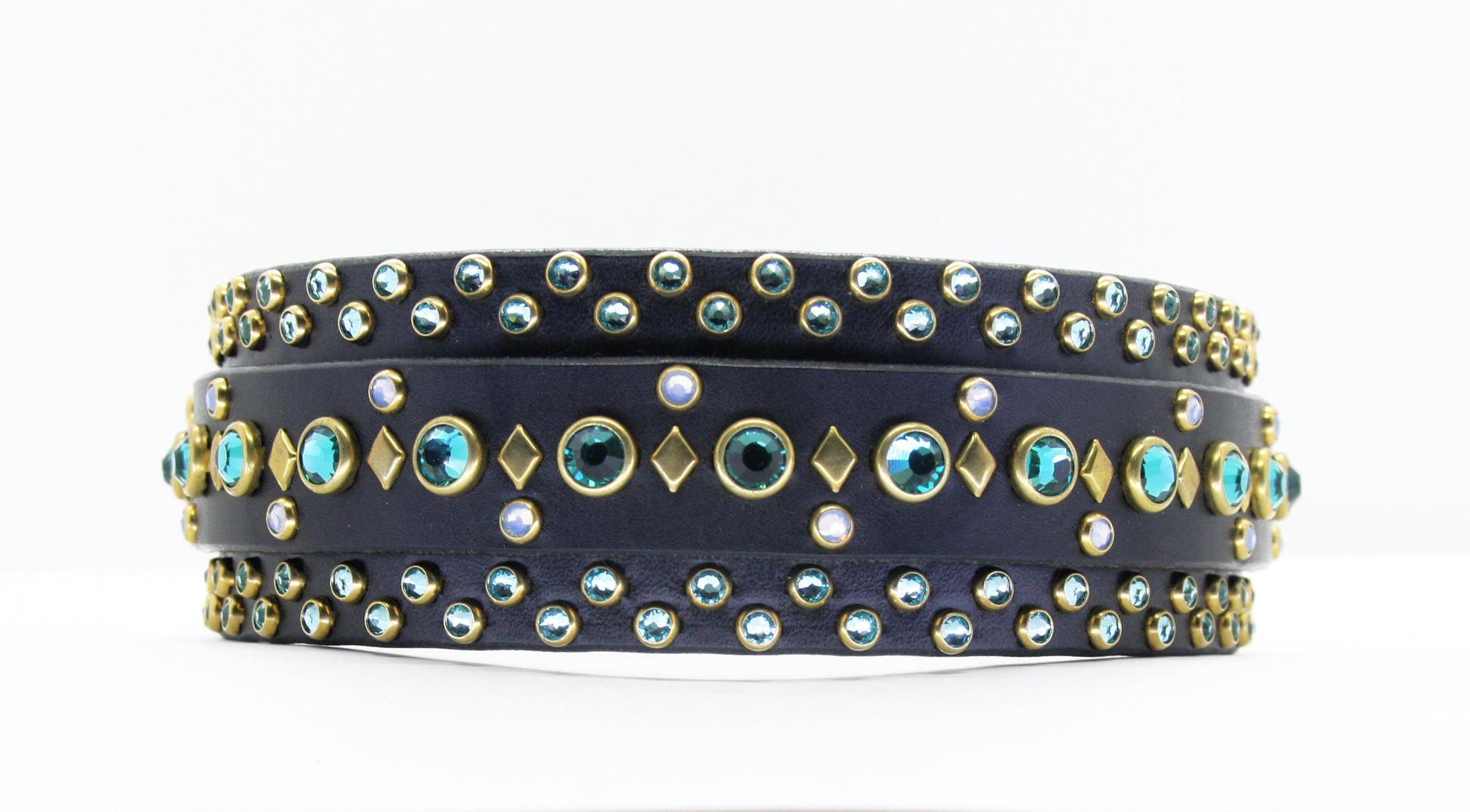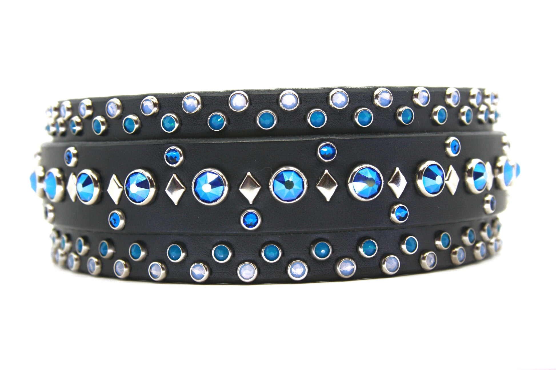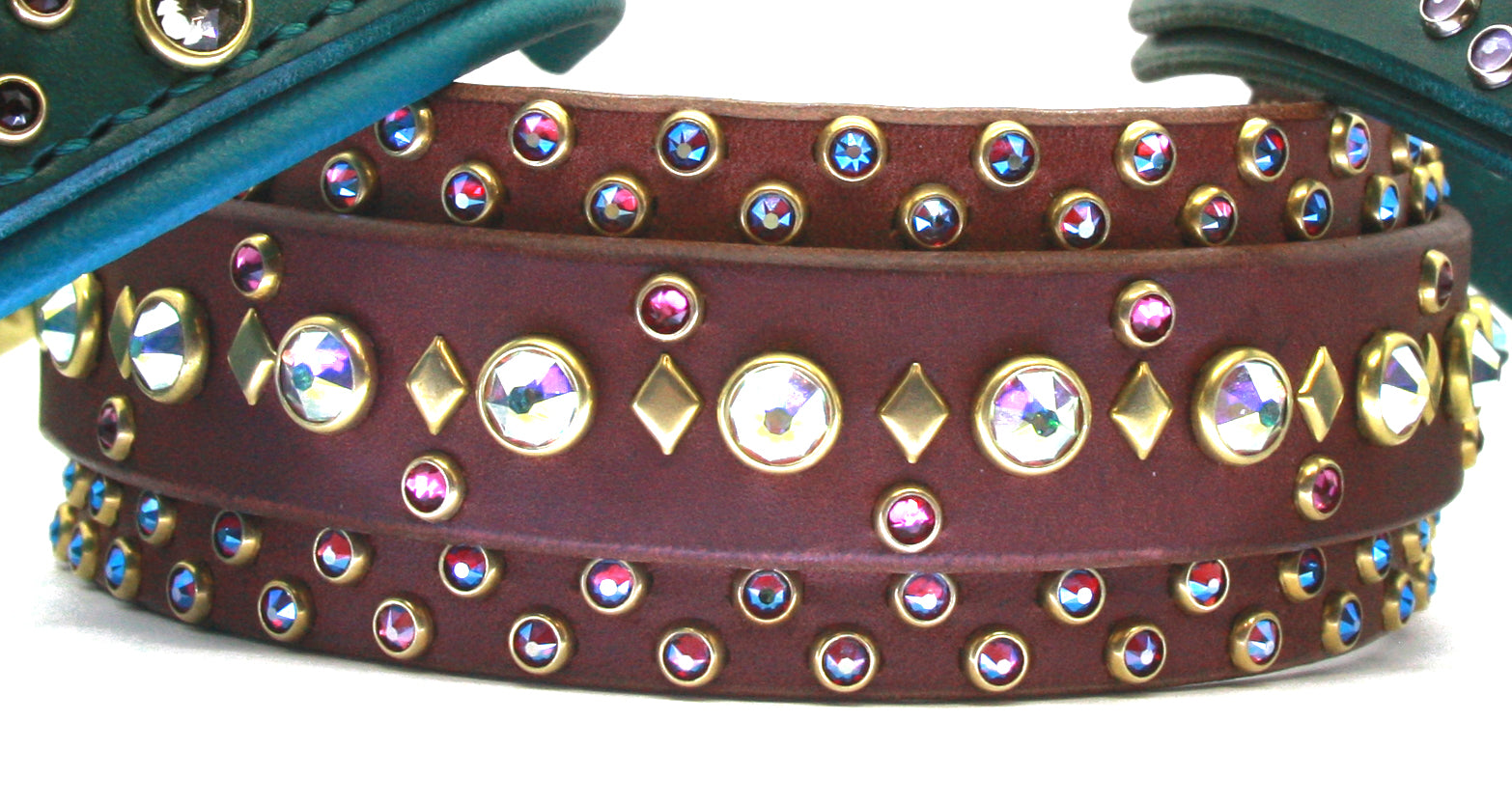 The 2" Jester is a double layer design with a 2" base panel and a 1" top panel. The base has a double row crystal border, the top panel has a single centered row of 40ss crystals and small flat diamond spots and alternating 20ss crystals.