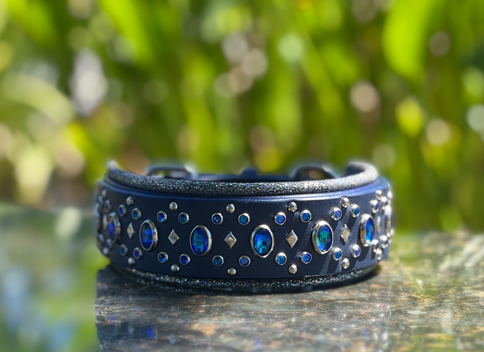 Collar examples are: Double layer no lining 1.5" teal green base with fern/shamrock crystals and opal green #13 cabs. Single layer lined 1.75" purple sage base with rose crystals and white shimmer #1 cabs. Double layer no lining 2" Havana base with crystal border in alternating burgundy delite and fuchsia shimmer, top panel with ruby crystals and rich burgundy #6 cabs.