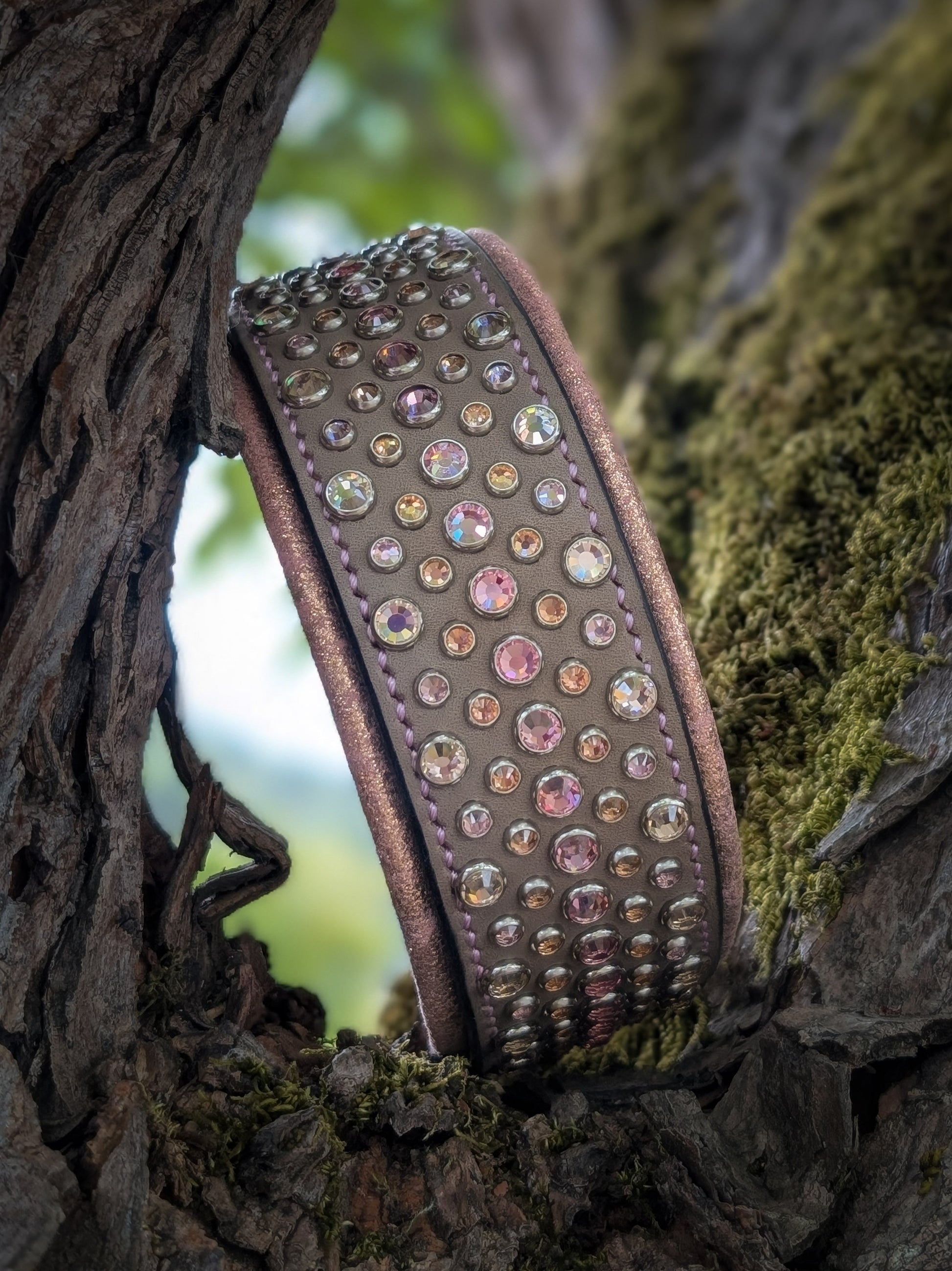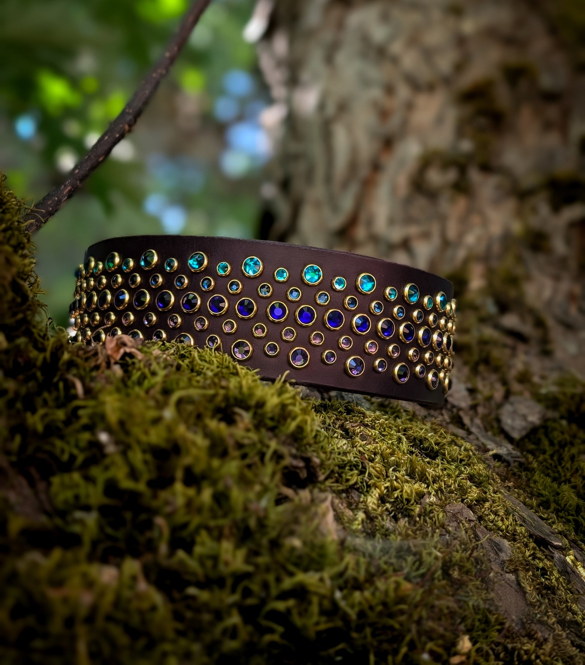 The Dazzle is a crystal heavy design with all 34ss and 20ss crystals. It has a LOT of sparkle and pizazz! This design can be with or without lining, 1.75” or 2” base width.