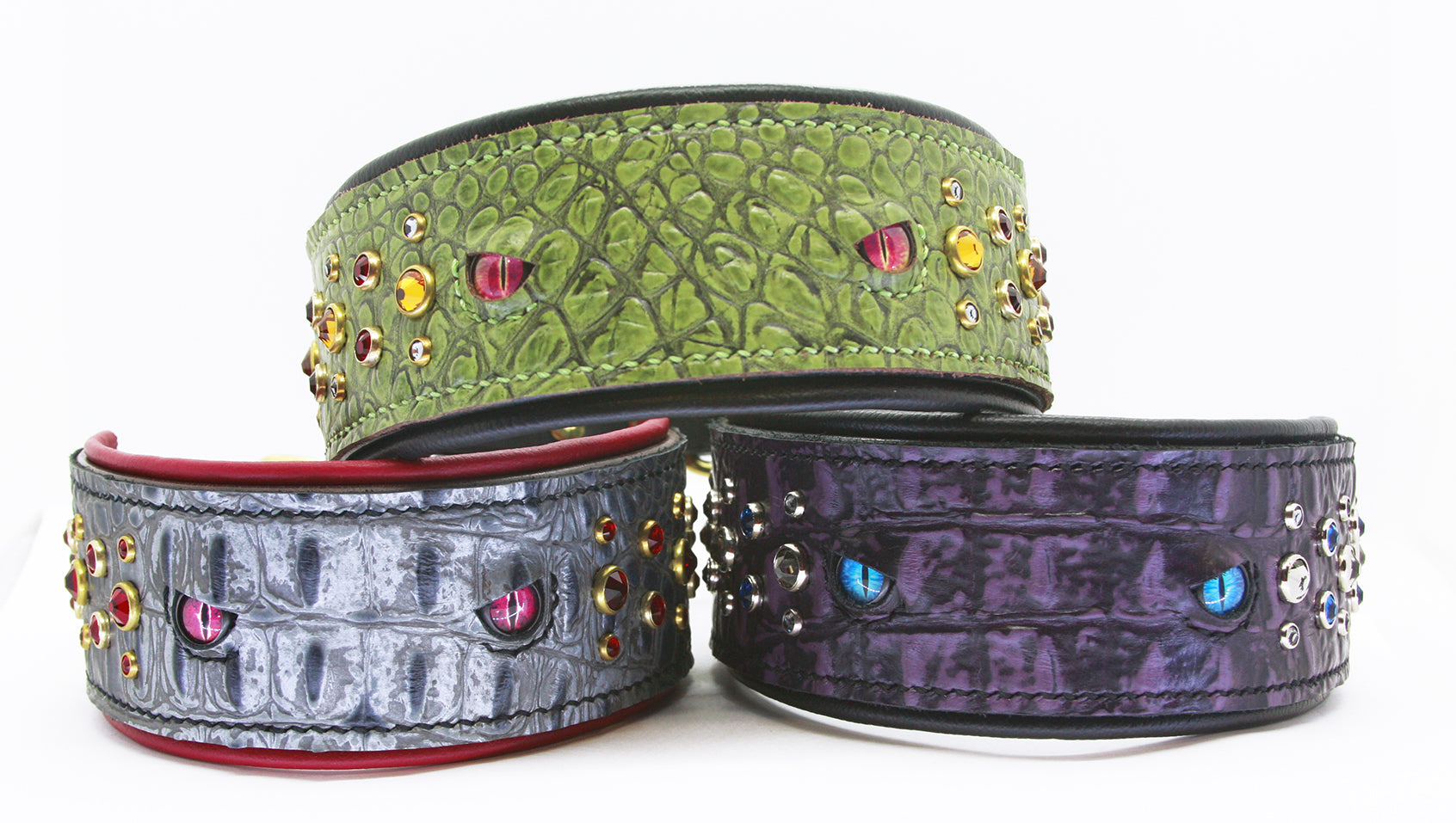 The Draconis is a single layer collar with lining. Gator embossed or python print leather on the main panel (not on the tail or buckle ends) with dragon eye cabochons centered on the panel, and staggered lines of crystals to either side.