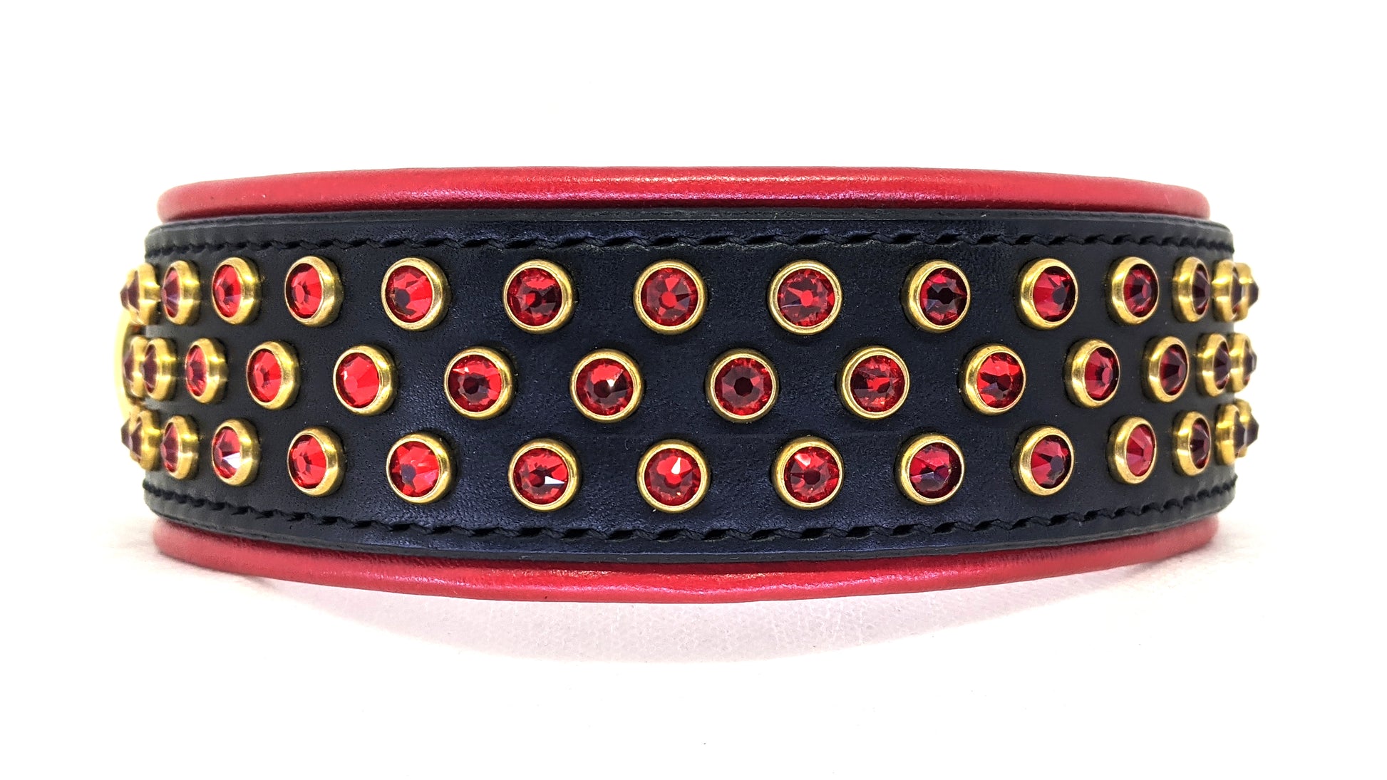 The Glitz is a very simple but very sparkly design with 3 offset rows of 34ss crystals, with or without lining. Available in 1.5" or 1.75" width base.