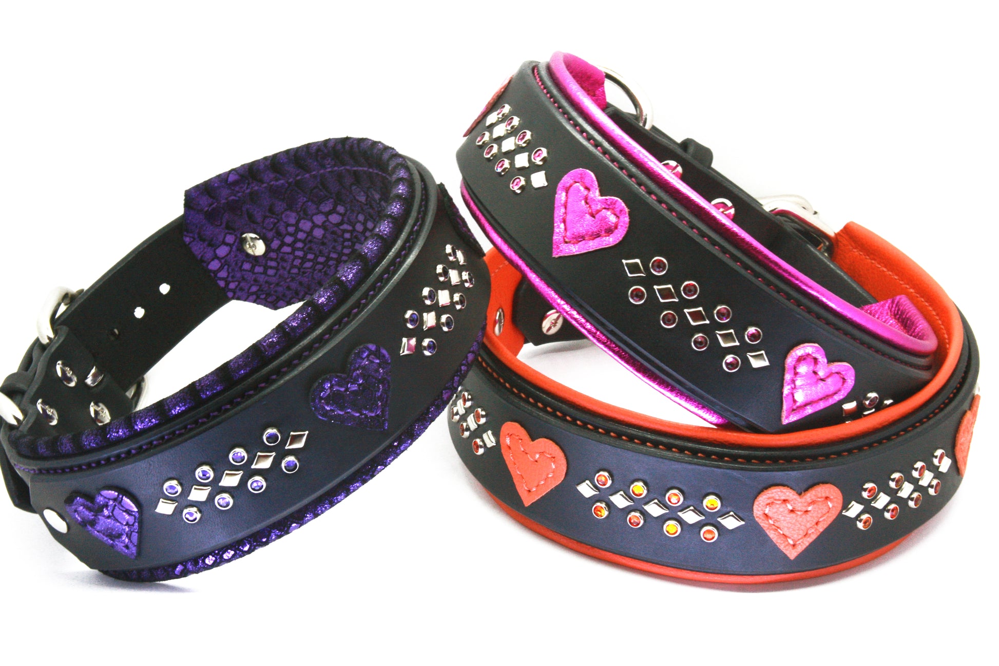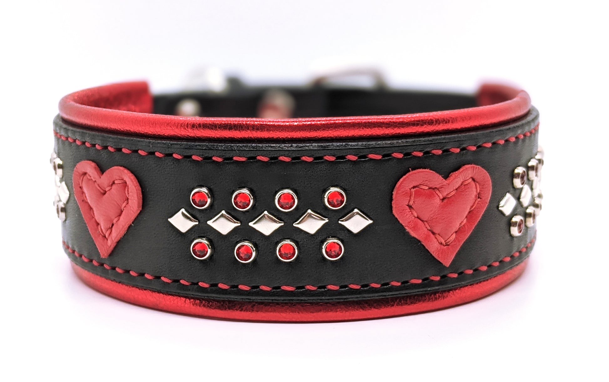 The Heart Dog is a simple but classic design with stitched on hearts and a repeating pattern of small flat diamond spots and 20ss crystals.