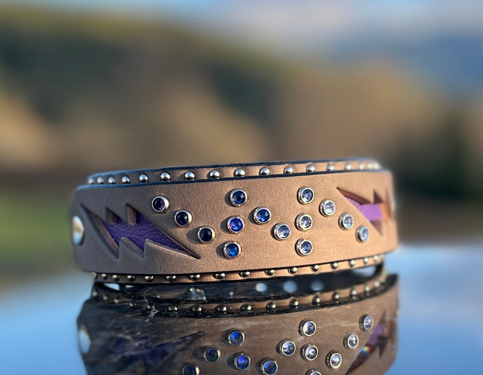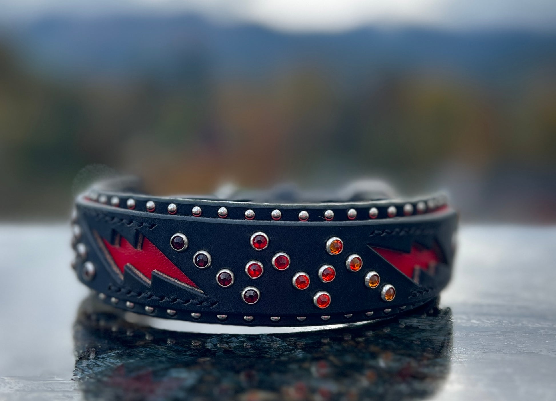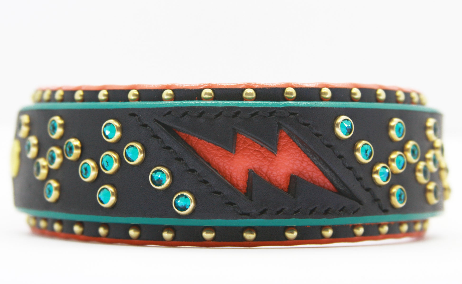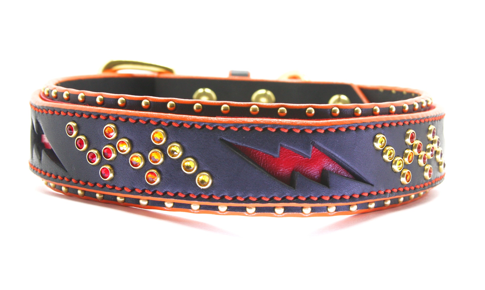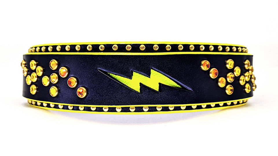 The Hot Rod design is a double layer collar with lightning bolt cutouts and 20ss crystals in the shape of lightning bolts on the top panel, and a round spot border on the base. It is available as a 1.5", 1.75", or 2" base.
