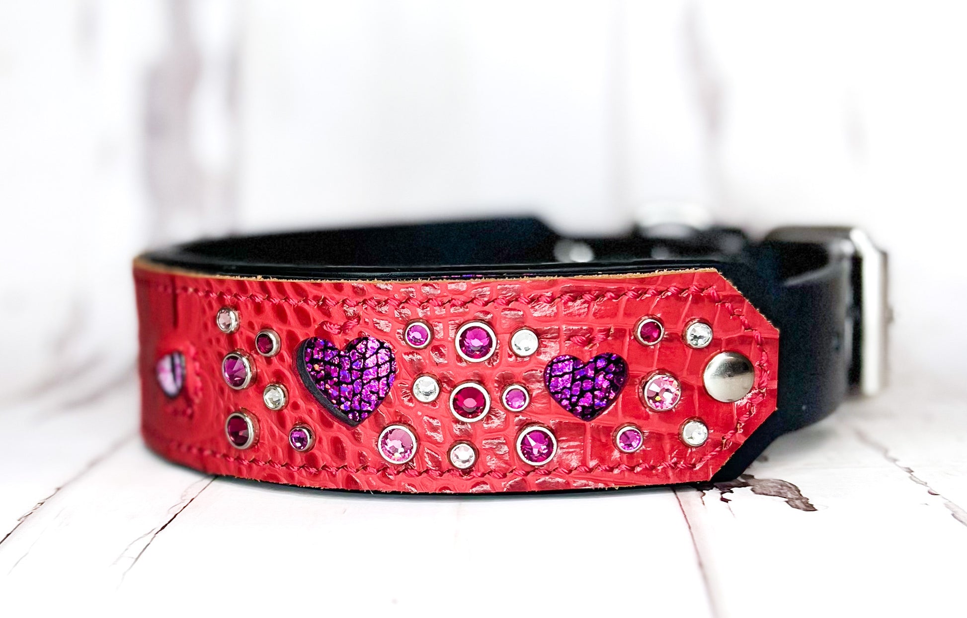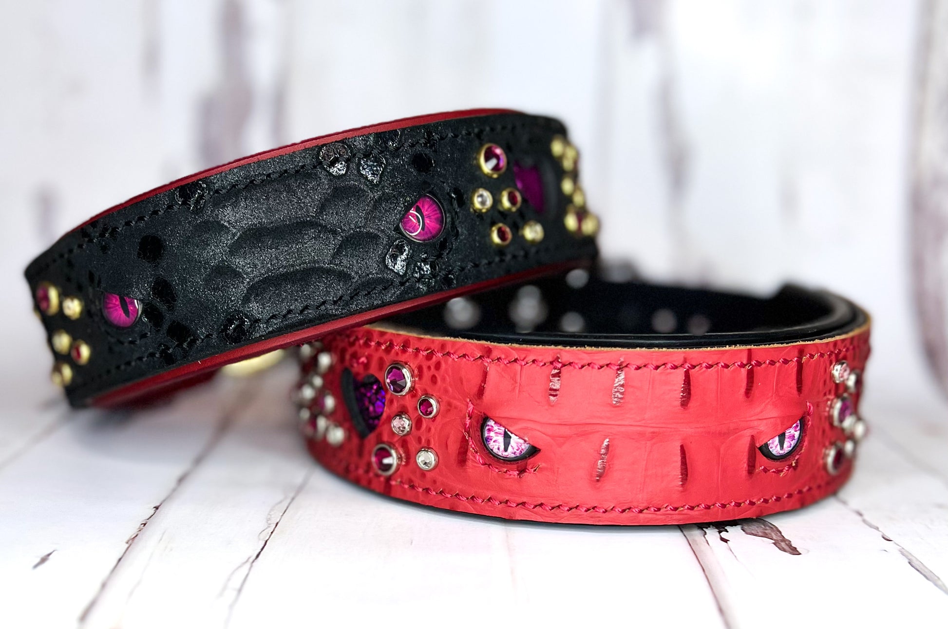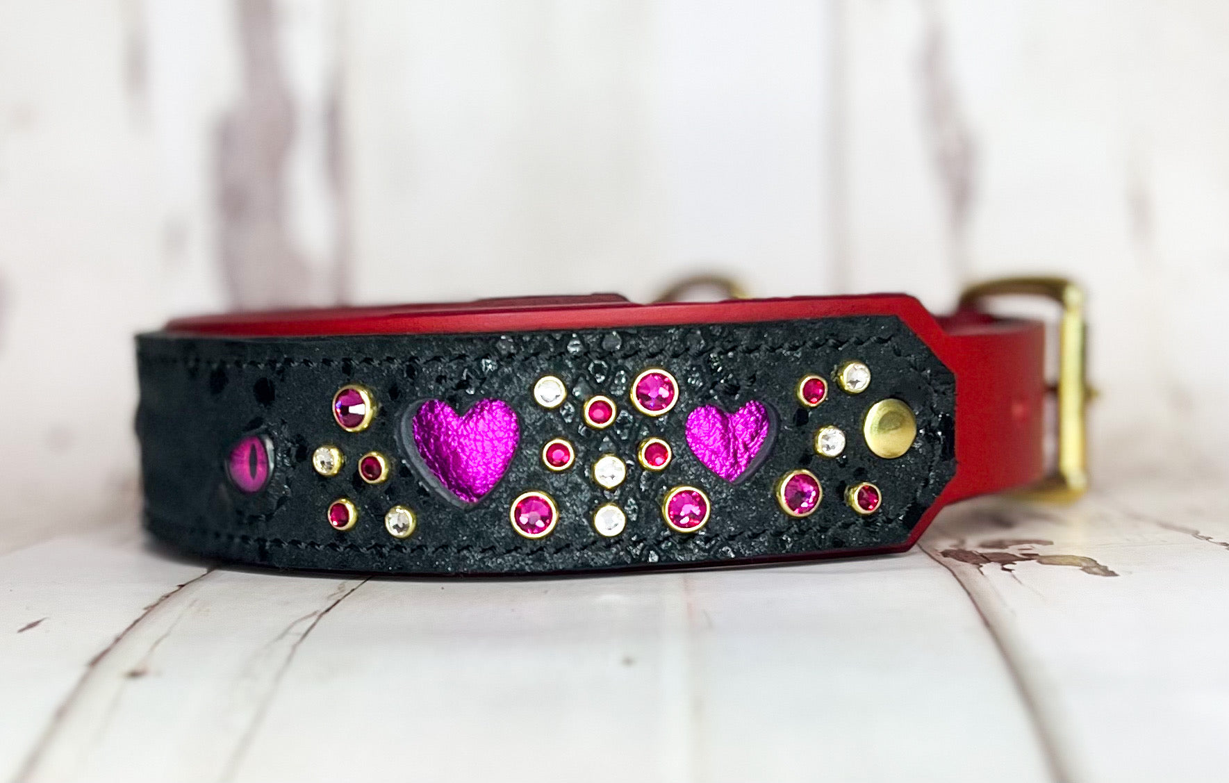 The top panel has alligator embossed or python print overlay, heart cutouts, inlay and glass dragon eye cabochons. The base is bare leather (no overlay) and is not lined/padded.