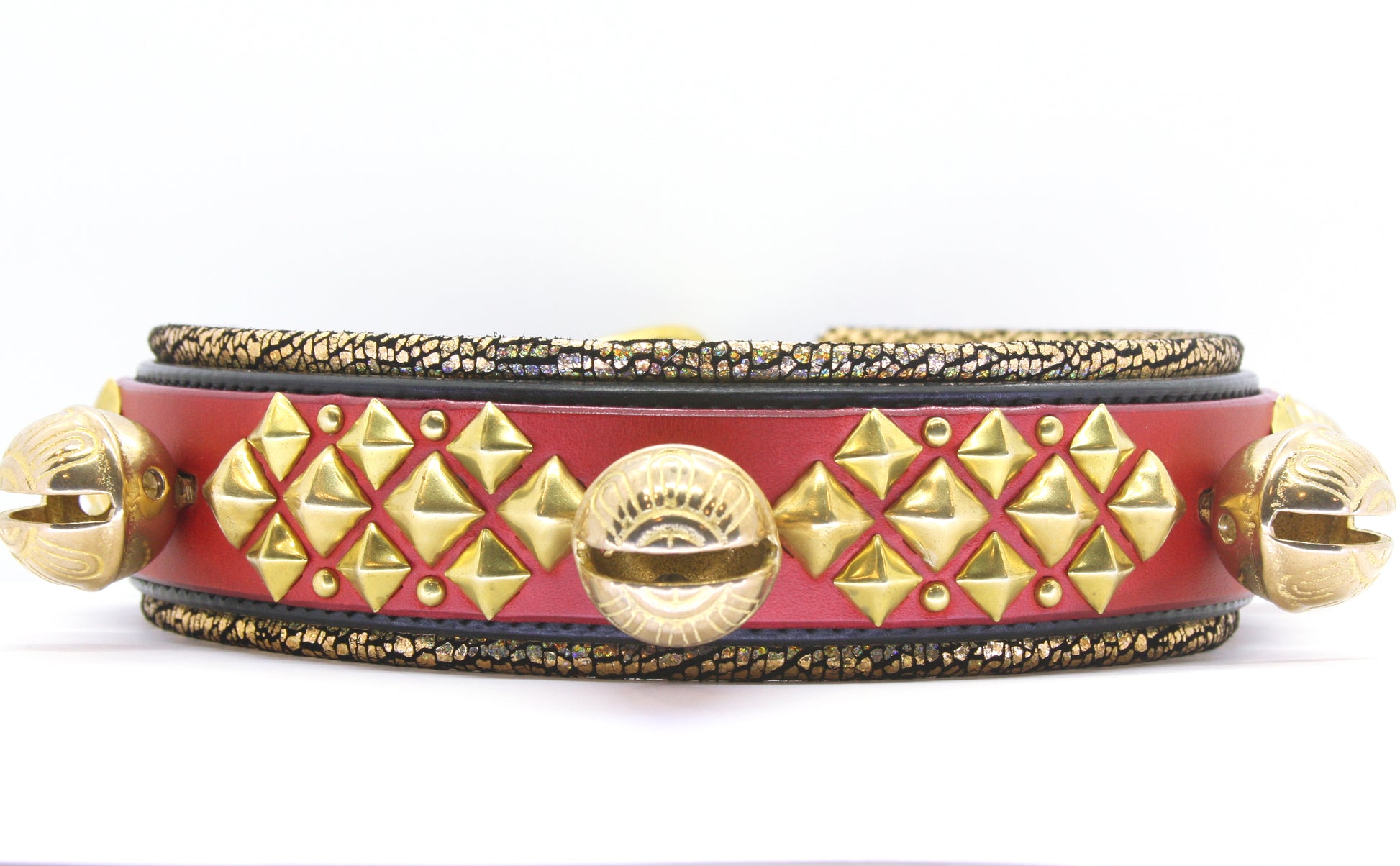 This is a double layer collar with 1 1/8" solid brass sleigh bells and your choice of brass or nickel hardware. Each collar will have 2-4 bells depending on the size of the collar. It is available as a 1.5", 1.75", or 2" base - adding lining increases the total overall width by approximately 3/8"