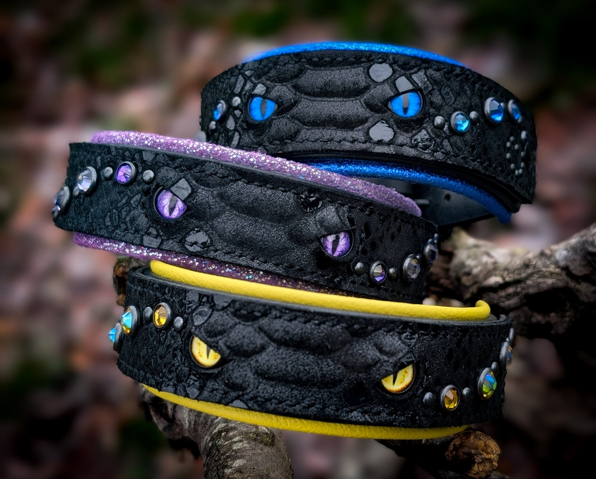The Maleficent Dragon Eye collar was originally done as a limited release and only available in the colors shown - purple and green. But now you can order it in your choice of colors! Choose your overlay, eye color, and crystal colors!
