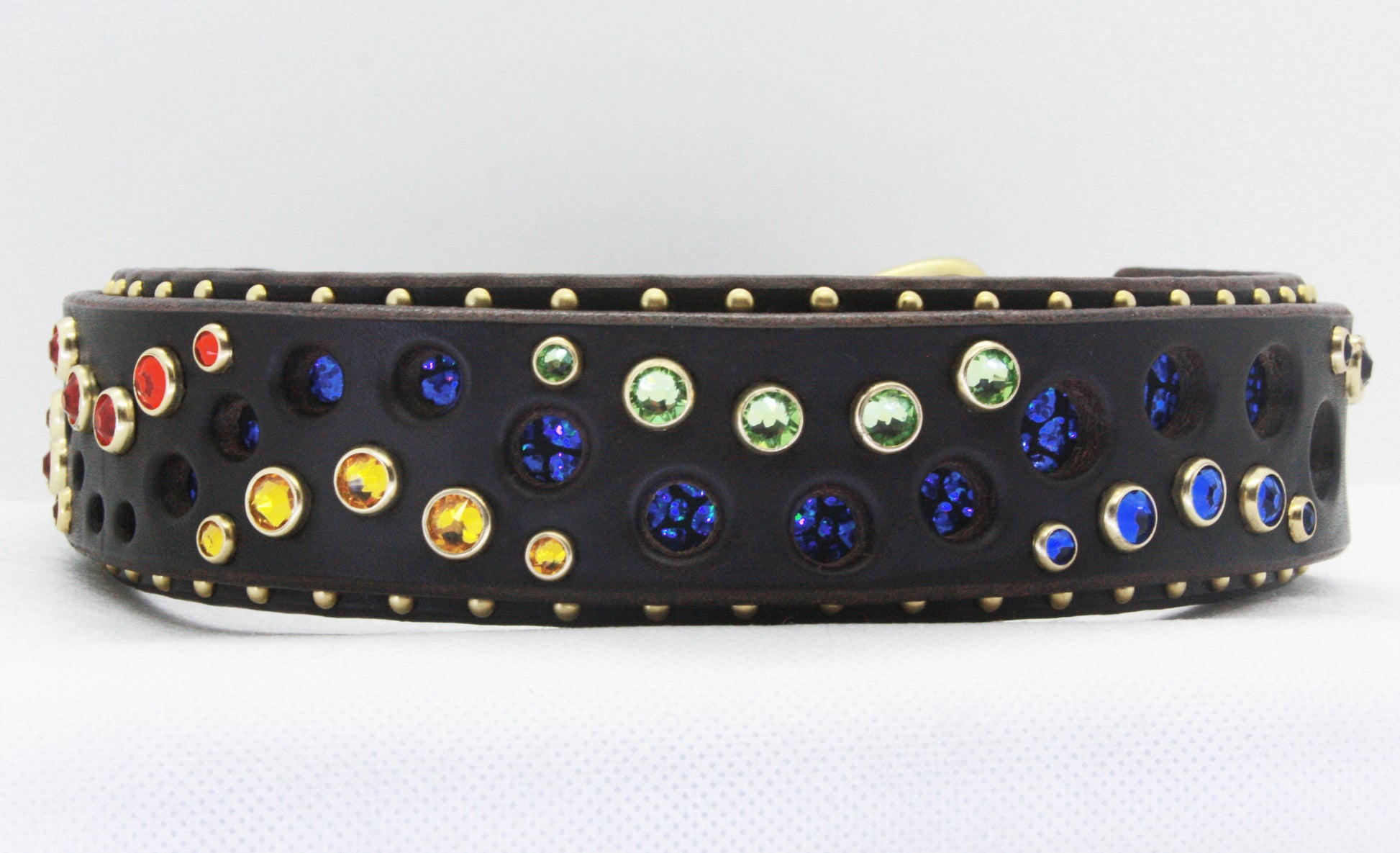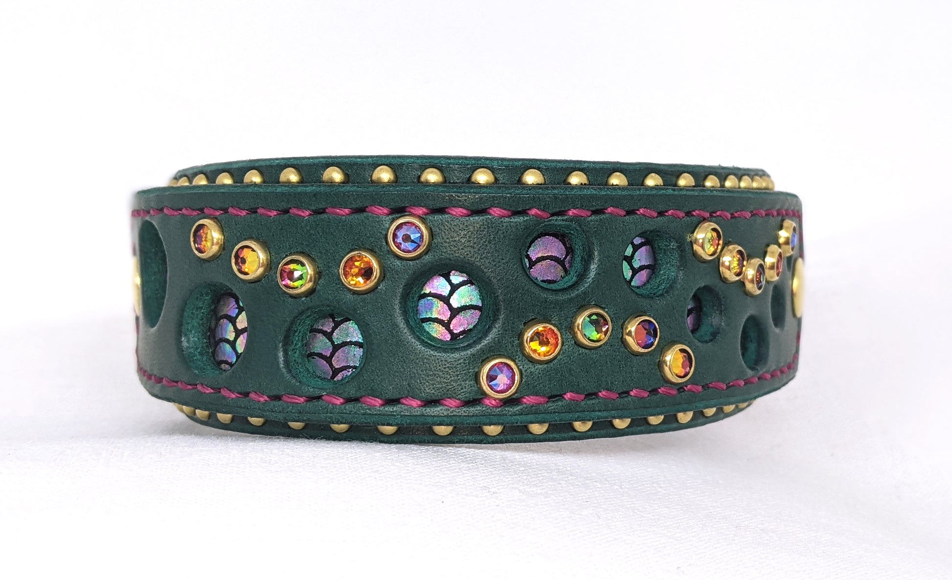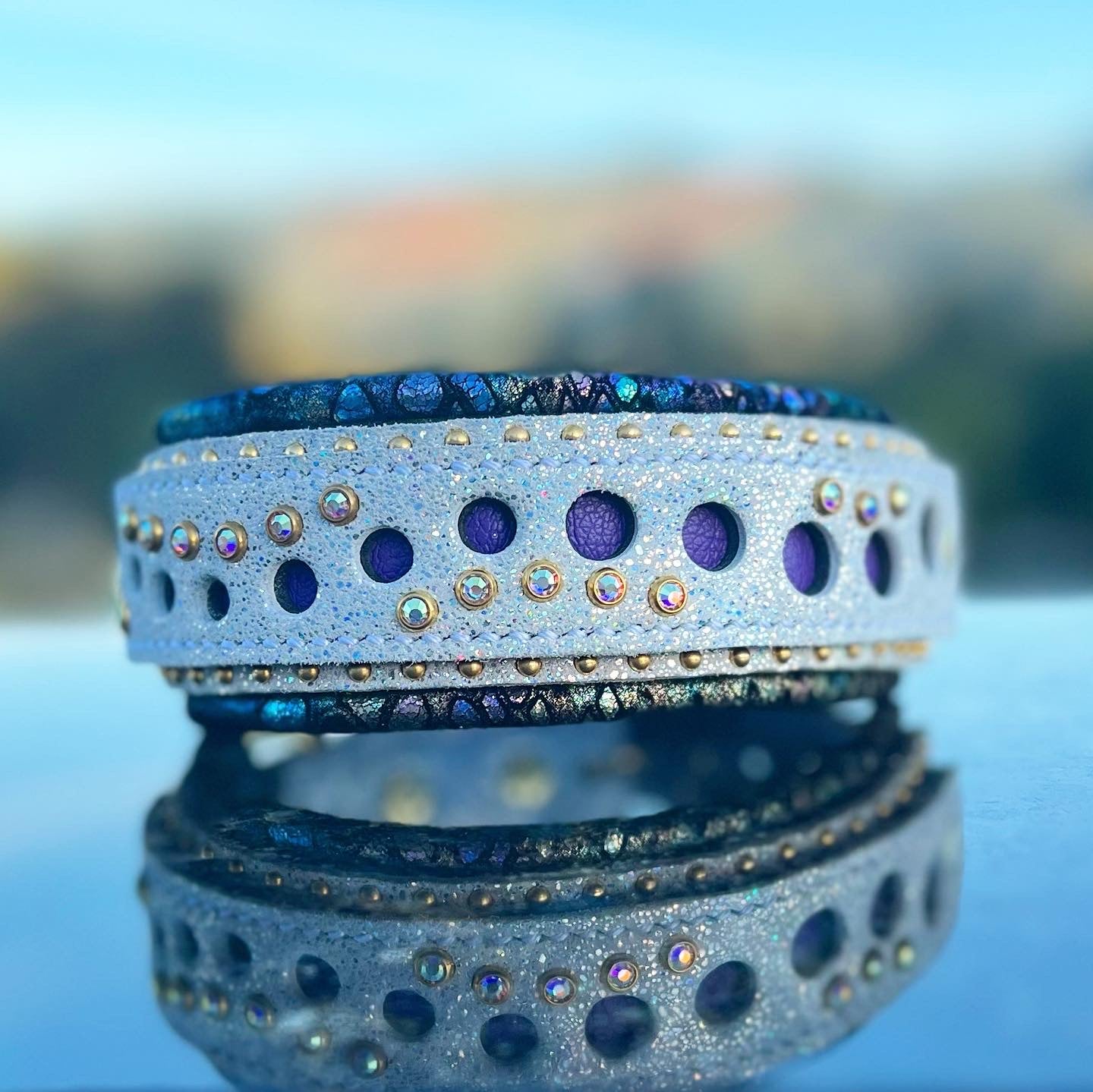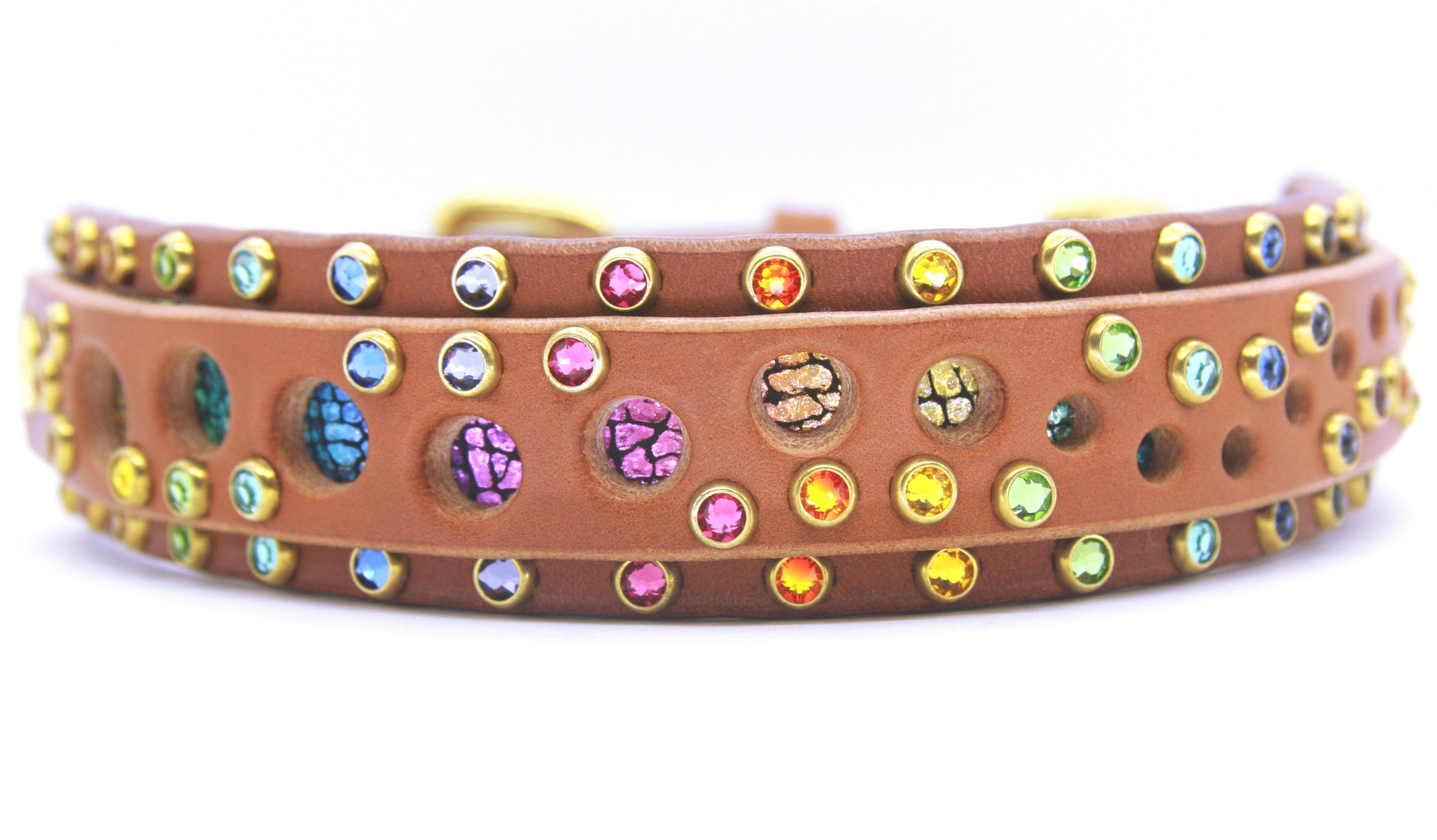 The Nebula is a double layer collar with a round spot border on the base and round cut outs of increasing sizes from one end to the other in a wave pattern on the top panel. Crystals are placed in a single curved line alongside the cutouts.