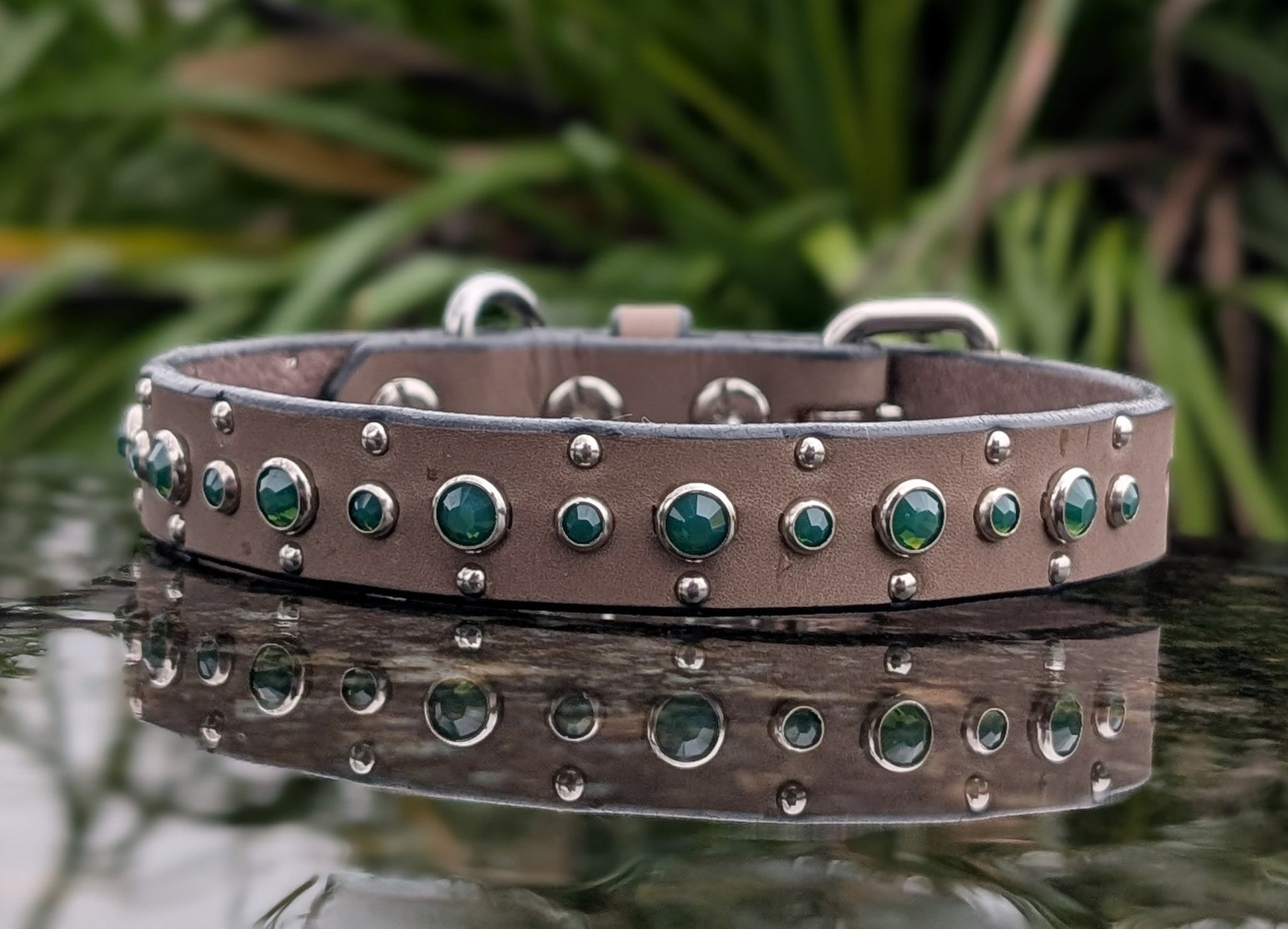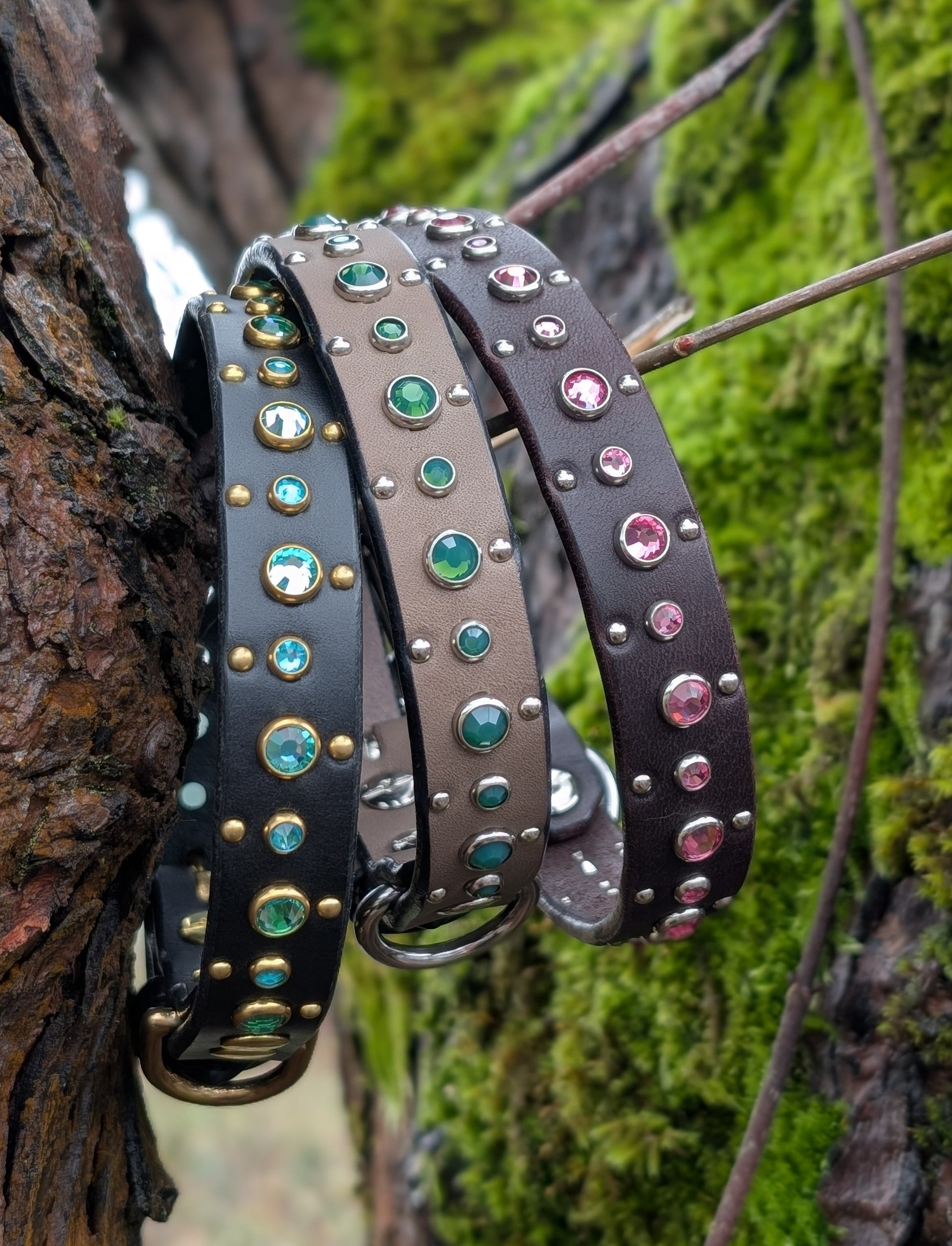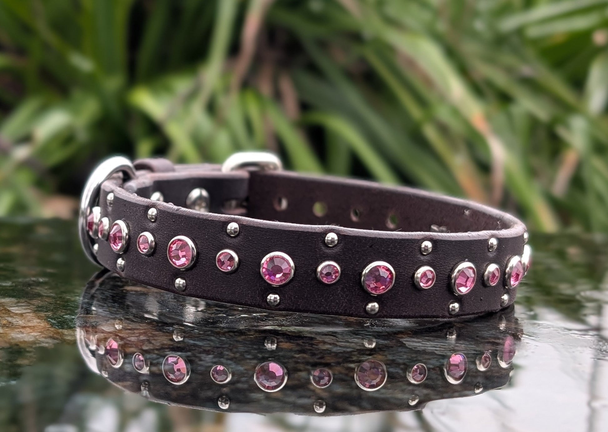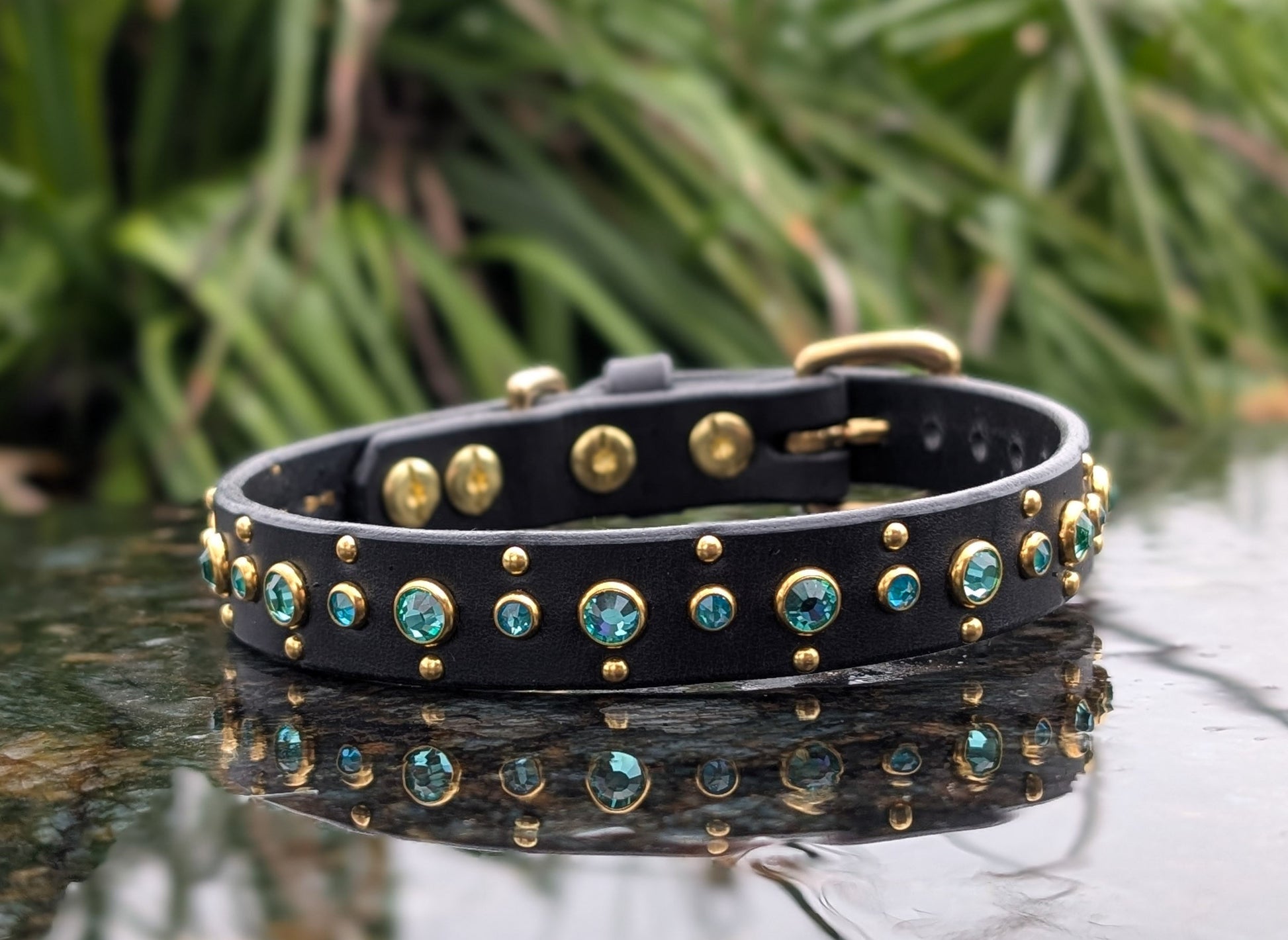 The Poppy collar is 3/4" wide and is available with regular nickel or brass hardware or in black hardware. If you select black hardware, the buckle will be a center bar buckle and not the roller buckle like for brass or nickel.