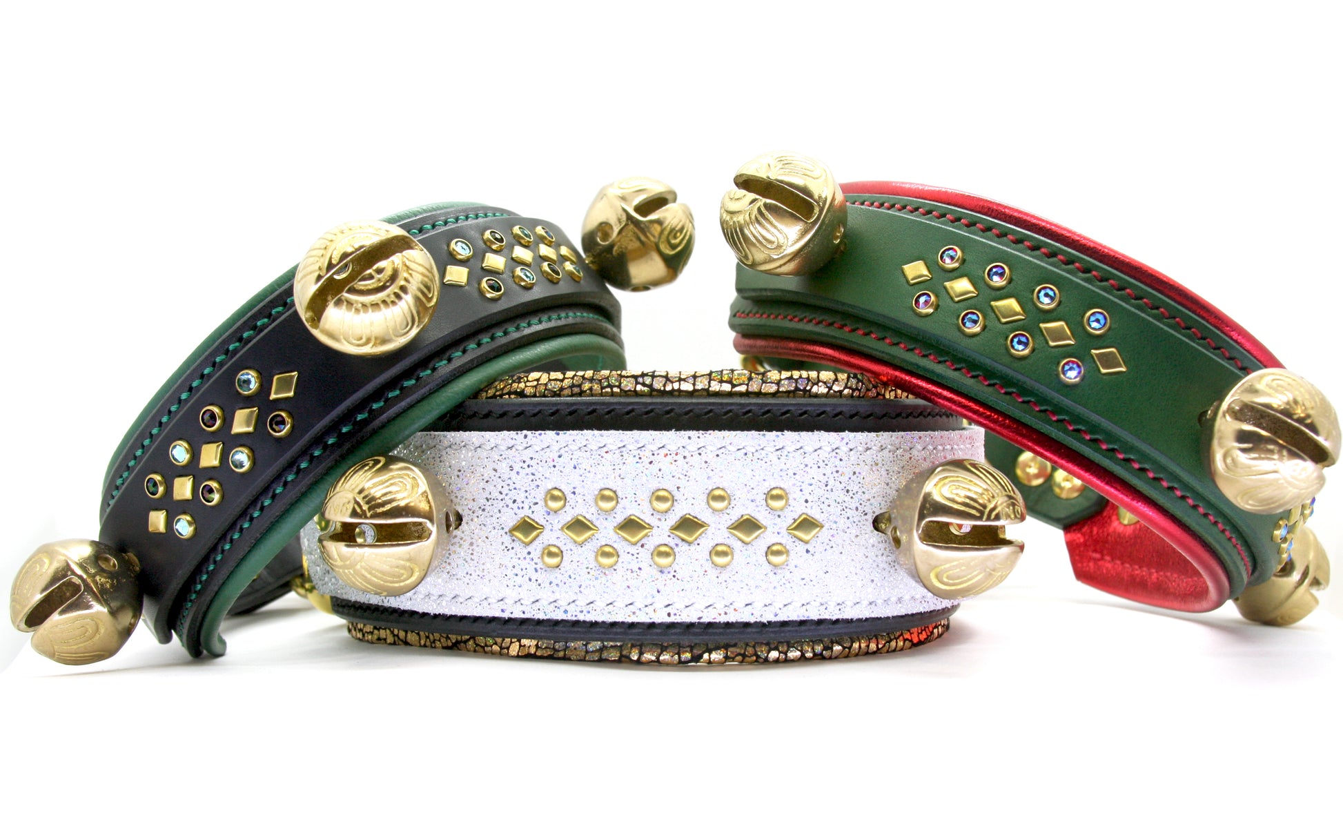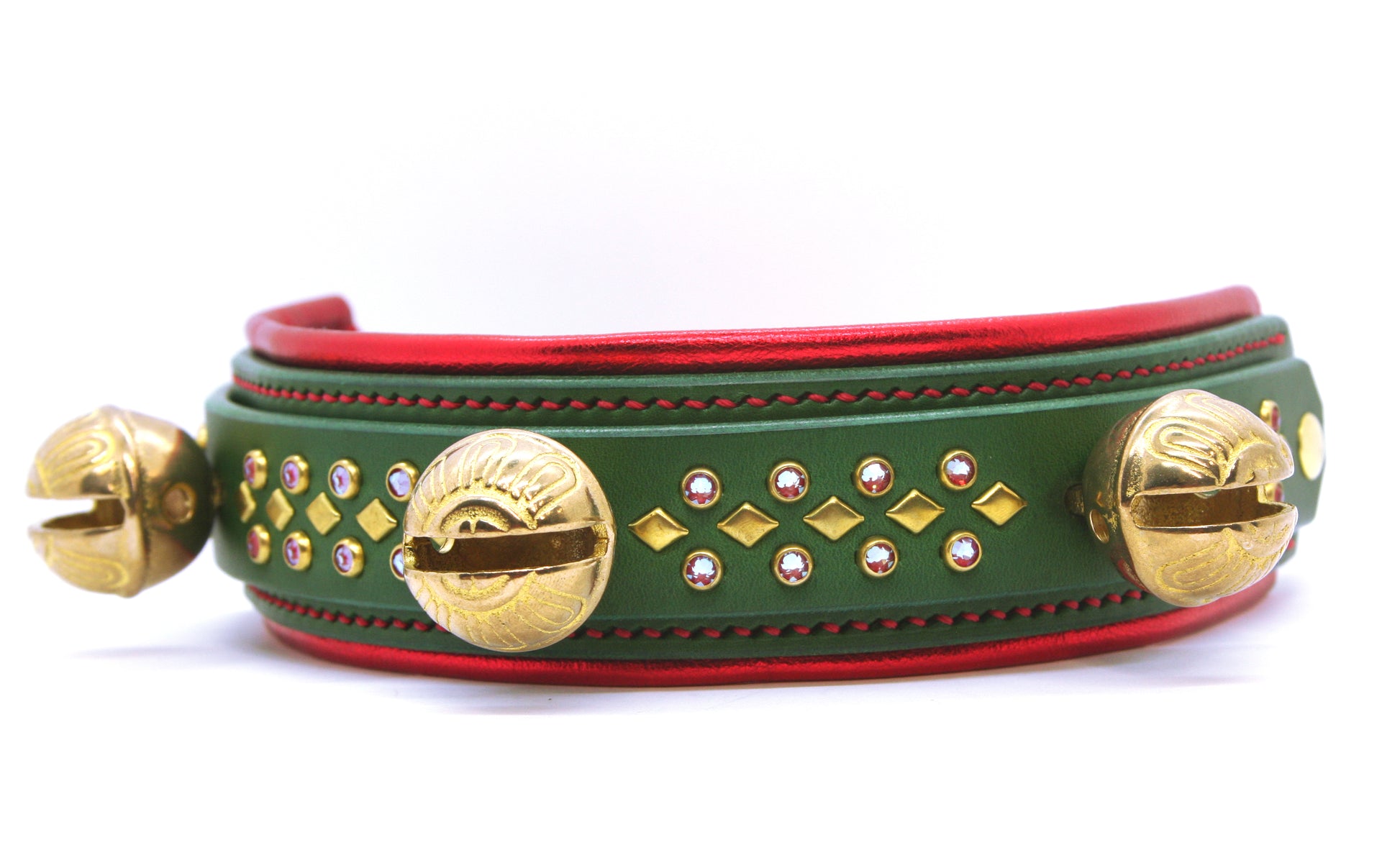 This is a double layer collar with 1 1/8" solid brass sleigh bells and your choice of all metal components or 20ss crystals with diamond spots in a repeating pattern on the top panel. Each collar will have 2-4 bells depending on the size of the collar. The base panel has an alternating round and oblong spot border OR the option to add lining(not both). It is available as a 1.5", 1.75", or 2" base - adding lining increases the total overall width by approximately 3/8"