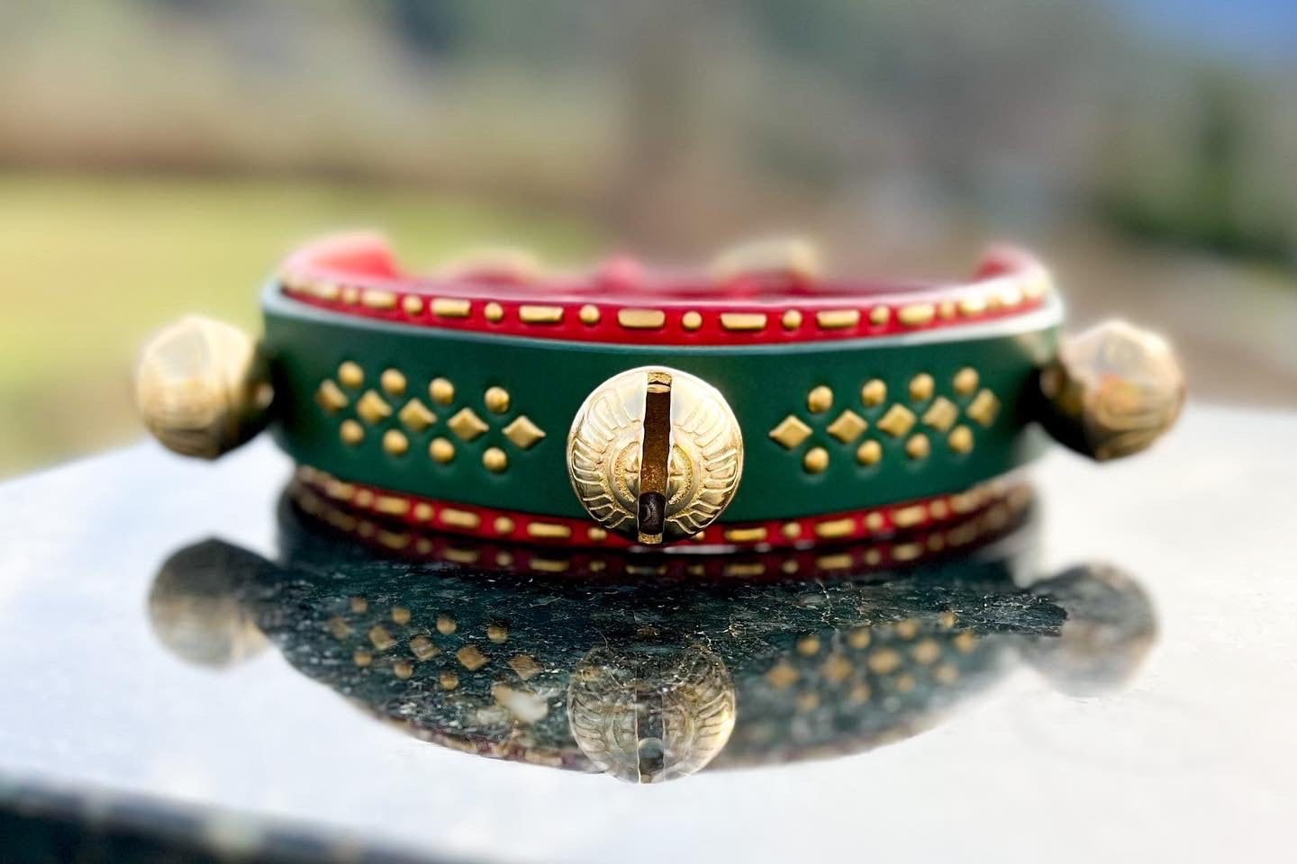 *** The dark green base leather is ONLY available as 1.75" wide base - there is an extremely limited amount of this leather left in stock! If you would like the dark green base or would like two-tone leather red/green put this in the NOTES box below!